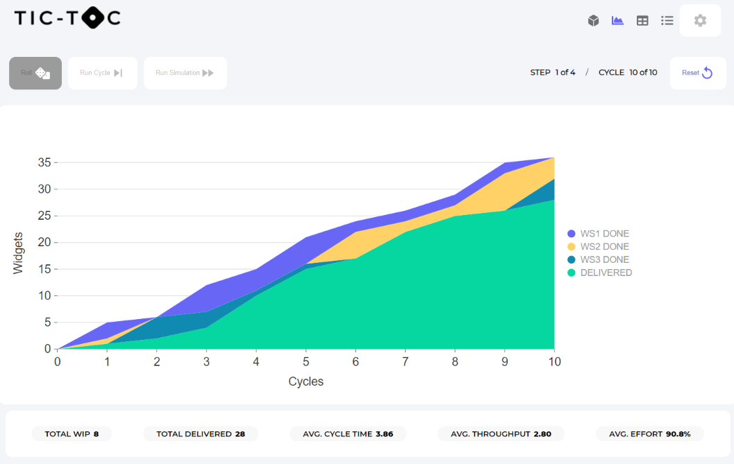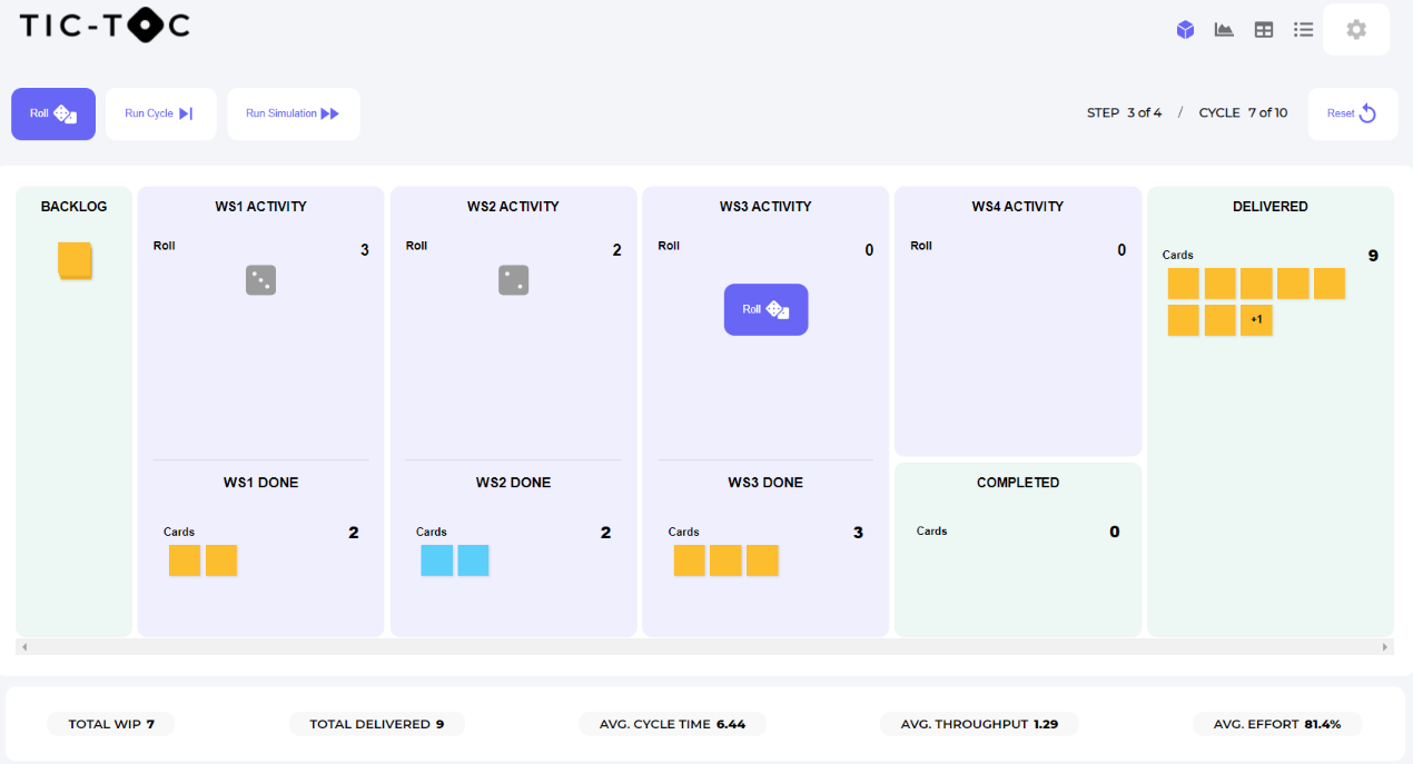 In any given iteration, each person in the workflow has the same potential output/productivity and is represented with the roll of a dice. The dice roll simulates a perfectly balanced system and allows for the variability of work: some tasks are easier or harder than others and some days we are more productive than others, but in this simulation we are all - on average - equally capable, we are perfectly balanced.